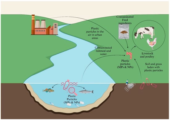 MP-NP pollution has become a growing concern for livestock and poultry globally, as plastic particles have been detected in a variety of animal species and environments. Studies have shown that these small plastic particles are present in feed, water sources, and even in the air, exposing animals to continuous ingestion and inhalation of plastic contaminants [39,40]. Once ingested, MPs can accumulate in the gastrointestinal tract of animals, leading to potential health issues such as inflammation, reduced nutrient absorption, and physical damage to internal organs [41]. Research in several countries has revealed the presence of MPs in livestock, including cattle, sheep, and poultry [42]. Contaminated feed and water sources are the primary routes through which plastics accumulate from polluted environments [20,21]. Fish meal, meat and bone meal (MBM), and soybean meal are important protein sources for livestock and poultry feeds in Bangladesh [43]. Several studies conducted in Spain, Ireland, China, and India reported that almost every investigated animal and poultry feed, including fishmeal and soybean meal, was contaminated with MPs such as polypropylene, polystyrene, polyethylene, polyamide, polyethylene terephthalate, and Polyvinyl Chloride MPs [40,44,45,46]. Manure and sewage sludge, often used as fertilizers, can introduce MPs into the soil, which are then ingested by animals. Animals grazing on plastic-laden soils or ingesting contaminated forage are also at risk of plastic particles [47]. Additionally, MPs-NPs can enter through the inhalation of airborne particles, particularly in industrial or urban areas [48]. The use of plastic-containing products, such as packaging or feed additives, further exacerbates exposure [20,47]. The infiltration pathways are shown in Figure 1.