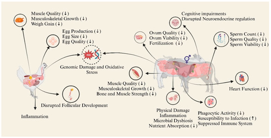 MPs-NPs have become pervasive environmental pollutants, raising significant concerns for livestock and poultry health. While direct studies on these animals are limited, insights from several experimental models provide a basis for understanding potential impacts. Studies on rodents and aquatic species demonstrate that MPs and/or NPs induce oxidative stress, inflammation, immune system dysfunction, and reproductive toxicity, which could similarly affect farm animals, including livestock and poultry. Disrupted gut microbiota, impaired nutrient absorption, and reduced fertility observed in models (Table 2) suggest adverse effects on growth, productivity, and overall health in farm animals, compromising meat and egg quality while posing food safety risks due to the bioaccumulation of plastic particles. The adverse effects of MPs and NPs on the different biological systems of farm animals are demonstrated in Figure 2. Moreover, their adverse effects on the various biological systems of farm animals are extensively discussed herein.