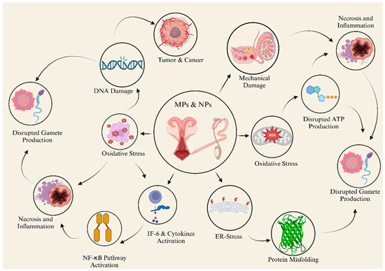 The presence of MPs-NPs in the environment has raised significant concerns regarding their potential impacts on reproductive health in farm animals. Studies conducted on various experimental models suggest that exposure to MPs and NPs can lead to reproductive toxicity through mechanisms such as oxidative stress, endocrine disruption, inflammatory responses, genetic alterations, and direct cellular damage, which could have similar implications for livestock and poultry species.