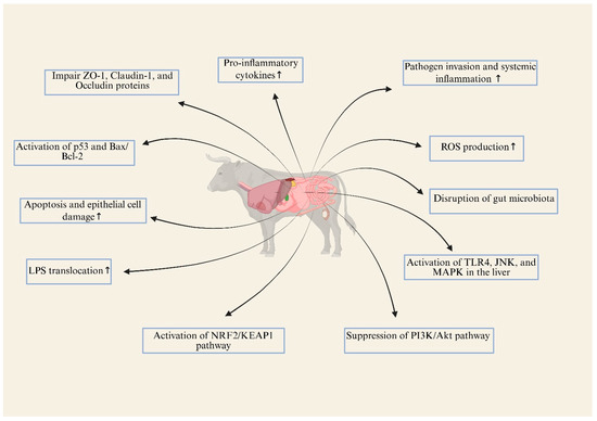 MPs have been shown to impair the integrity of the intestinal barrier, making animals more susceptible to inflammation, increased permeability, and reduced mucus production. Studies have demonstrated that MPs can lead to decreased mucus secretion and damage to the intestinal epithelial lining, resulting in compromised gut barrier function and increased exposure to harmful pathogens [66]. Additionally, MPs alter the expression of genes responsible for maintaining intestinal tight junctions, further exacerbating intestinal permeability and promoting inflammatory responses [93]. Polystyrene MPs have been linked to the necrosis and pyroptosis of intestinal tissues in avian models, accompanied by disruptions in the gut vascular barrier, allowing toxins to enter the systemic circulation [68]. These effects can be significantly observed in poultry species, potentially leading to compromised intestinal integrity, increased susceptibility to systemic infections, impaired nutrient absorption, and overall reduced health and productivity.