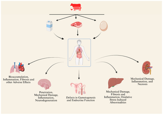 Furthermore, MPs/NPs often carry adsorbed toxicants like Pb, Ni, Co, and persistent organic pollutants, amplifying their toxicity [112,113]. Thus, regulating plastic exposure in animal farming and monitoring contamination in animal-derived foods are critical to protect public health and food security. The probable pathways and potential effects of MPs-NPs on human health have been demonstrated in Figure 5.