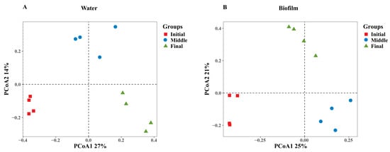 PCoA based on Bray–Curtis’s matrix indicates differences in bacterial community composition in the system. Bacterial communities in water (A) and biofilm (B). Initial, days 15–31; middle, days 46–61; and final, day 76.