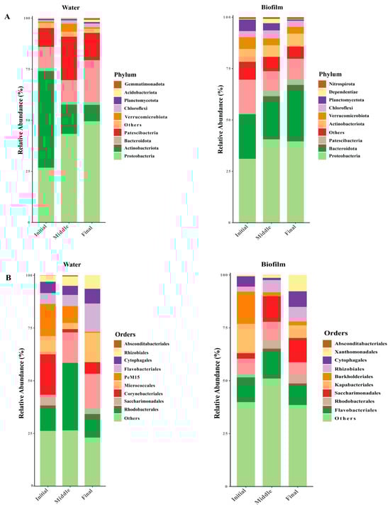 Relative abundance of bacterial communities’ dominant phylum and order levels (top 10) at different times. Bacterial composition in water and biofilm at the phylum level (A). Bacterial composition in water and biofilm at the order level (B).