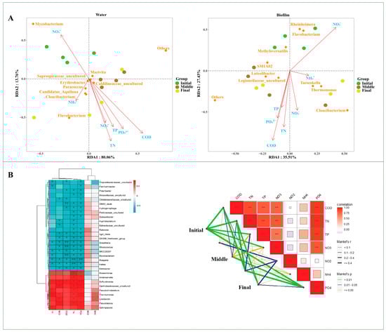 Exploring the relationship between microbial communities and environmental factors using RDA (A). RDA explores the relationship between water and biofilm microbial community genera and total nitrogen (TN), chemical oxygen demand (CODMn), nitrite (NO2−-N), phosphate (PO43−-P), total phosphorus (TP), nitrate (NO3−-N), and ammonia (NH4+-N). Environmental correlation of microbial communities, as evaluated by a heat map (* p < 0.05, ** p < 0.01, *** p < 0.001) and Mantel tests (B).