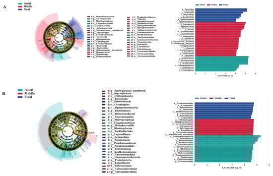 The LEfSe analysis identified significant potential biomarkers across three experimental groups: initial, middle, and final. A total of seven genera in both water and biofilm samples were identified as potential biomarkers, with an LDA threshold value of 4. In the water column of the initial group, Mycobacterium emerged as the key biomarker. In the middle group, Marivita, Haloferula, Luteolibacter, Pedomicrobium, and Algoriphagus were identified as the dominant biomarkers, while in the final group, Taeseokella was identified as the predominant biomarker (Figure 4A). Conversely, in the biofilm community, the initial group was characterized by potential biomarkers such as Rheinheimera, Methyloversatilis, Pseudomonas, and Hydrogenophaga. The middle group included Luteolibacter, whereas, in the final group, Taeseokella and Thermomonas were identified as the dominant biomarkers (Figure 4B).