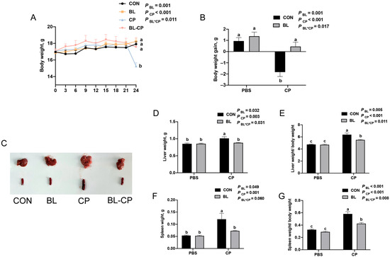 Figure 2. B. licheniformis alleviated C. perfringens infection. (A) Body weight of mice. (B) Body weight changes in mice. (C) Morphology of liver and spleen. (D) Liver weight. (E) Liver index. (F) Spleen weight. (G) Spleen index. Bars with different letters are statistically significant (p ˂ 0.05) in different groups.