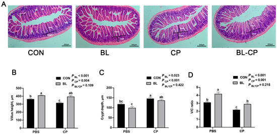 Histological analysis of ileum sections revealed that C. perfringens infection caused villus atrophy, crypt hyperplasia, and disrupted mucosal integrity (Figure 4A). Quantitative measurements showed significant reductions in villus height and V/C ratio, alongside increased crypt depth in the CP group (p < 0.05; Figure 4B–D). These histopathological alterations were markedly alleviated in the BL-CP group, suggesting that B. licheniformis maintains structural integrity of the intestinal epithelium.