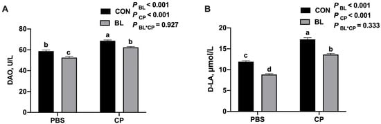 Figure 5. B. licheniformis modulated intestinal barrier during C. perfringens infection. (A) DAO content. (B) D-LA content. Bars with different letters are statistically significant (p ˂ 0.05) in different groups.