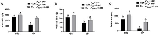 To assess microbial metabolic function, volatile fatty acids (VFAs) in the cecal contents were quantified. As shown in Figure 7A–C, C. perfringens infection significantly decreased the concentrations of acetic acid and butyric acid (p < 0.05), while B. licheniformis supplementation restored these levels. Notably, butyric acid levels were significantly elevated in the BL group compared to CON (p < 0.05). C. perfringens infection significantly reduced the level of propionic acid compared to the control group (p < 0.01). Although supplementation with B. licheniformis showed a trend toward increasing propionic acid levels in both uninfected and infected mice, the differences were not statistically significant when compared to the respective control groups (p = 0.107 for BL vs. CON; p = 0.686 for BL-CP vs. CP). These results suggest that B. licheniformis modulates SCFA production and maintains microbial fermentation capacity during infection.