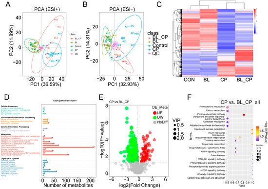 Figure 10. Summary of the metabolomics analysis in the cecal contents of mice. (A,B) PCA plot of mice’ cecal metabolome. (C) Hierarchical clustering analysis of cecal metabolites. (D) KEGG pathway classification. (E) Volcano plot of metabolites between CP and BL-CP groups. (F) Bubble diagram showing the KEGG enrichment analysis.