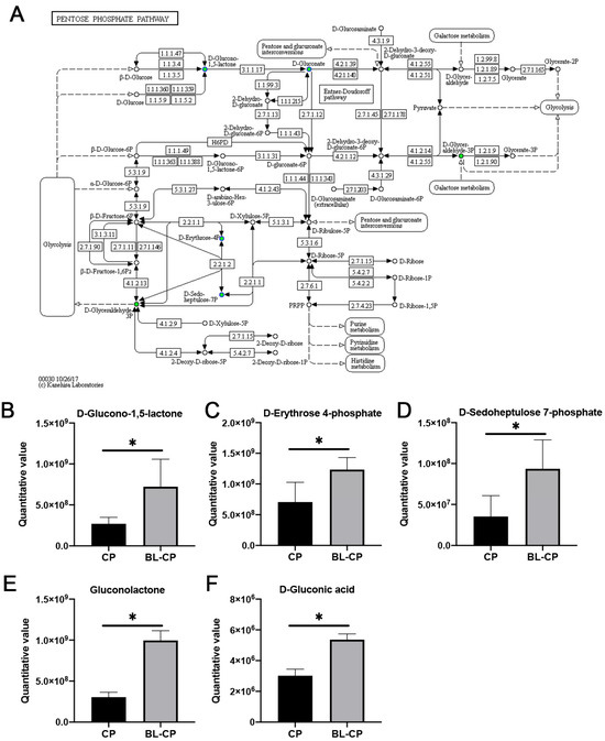 KEGG enrichment results revealed that the pentose phosphate pathway (PPP) was significantly enriched in BL-CP mice compared to CP mice (p = 0.0101; Figure 11A). Five key metabolites within this pathway—including D-glucono-1,5-lactone, D-erythrose 4-phosphate, D-sedoheptulose 7-phosphate, gluconolactone, and D-gluconic acid—were significantly upregulated in B. licheniformis-treated mice (p < 0.05; Figure 11B–F). This suggests that B. licheniformis promotes redox homeostasis and energy metabolism via the activation of the PPP under pathogenic challenge conditions.