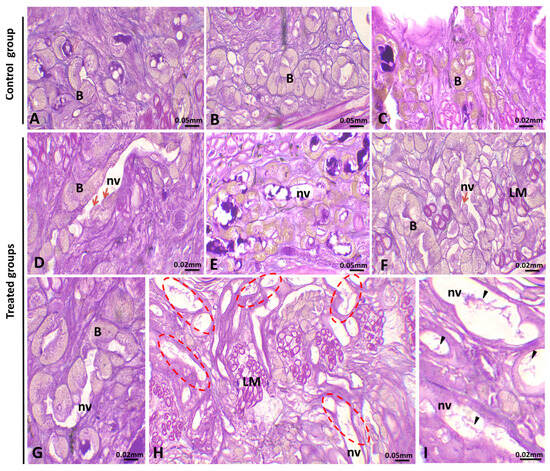 In the space between the musculocutaneous region and the digestive tube, there is a thick layer of loose connective tissue containing botryoidal tissue (Figure 4). In untreated leeches, nonactivated botryoidal cell clusters typically contained large, oval/rounded granular cells densely packed in a rope-like structure, occasionally forming small lacunae (Figure 4A–C). However, in all experimental groups (1, 10, 100, and 1000 µg/L of PE-MPs), a transition in the architecture of botryoidal tissue was observed, shifting from a clustered, cord-like arrangement to half-moon-shaped cells with a hollow, tubular structure (Figure 4D–I). At this stage, they were considered activated. Moreover, the alterations showed a concentration-related trend, with histopathological changes appearing more frequently and extensively at higher exposure levels.