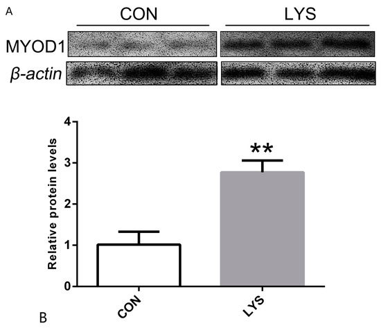3.3. The Effect of Lys on Myogenic Differentiation Protein Expression