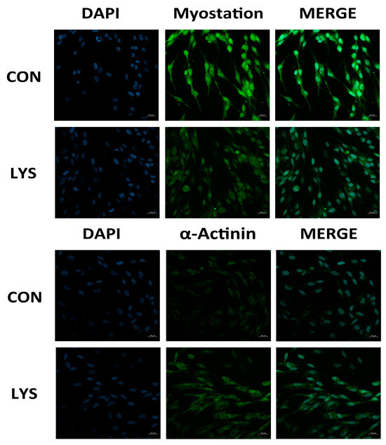 3.4. The Effect of Lys on the Expression of α-Actinin and Myostatin in SMSCs