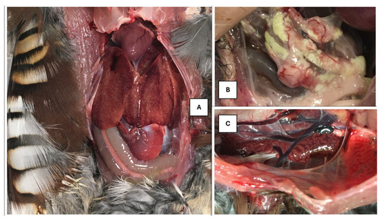 The necropsy revealed that the birds had suffered damage to the liver and kidneys, whilst other organs appeared unharmed. In the opened coelomitis, the placement of organs was normal. The liver of the necropsied bird was diffusely mottled, friable, and mildly enlarged, according to Figure 1A.