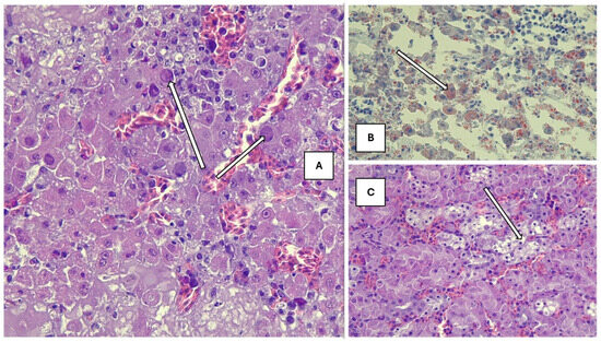 (A) Affected liver with eosinophilic cytoplasmic inclusions (H-E, 200× magnification). (B) Pathological fatty infiltration in the liver (Oil-Red-O, 200× magnification). (C) Tubular epithelial vacuolization (H-E, 200× magnification). Histopathological changes are pointed by arrows.