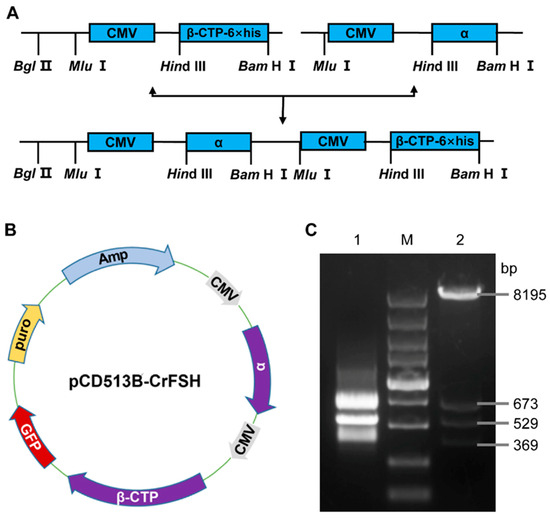 Construction and identification of the pCD513B- CrFSH. (A) Construction flowchart of CrFSH recombinant gene; (B) schematic diagram of the pCD513B-CrFSH vector, which included two target fragments, CMV-FSHα and CMV-FSHβ-CTP-6×His; (C) identification map of CrFSH recombinant gene. M indicates the DL5000 DNA marker; 1 indicates the fragment of FSHα-CMV-β-CTP-6×His; 2 indicates the pCD513B-CrFSH vector (β-CTP-6×His: 529 bp; CMV: 673 bp; α: 369 bp).