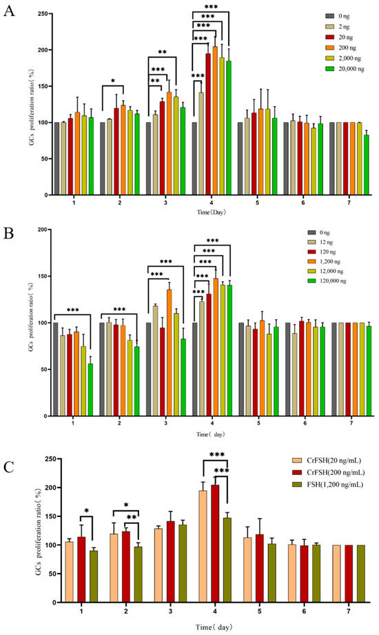 pFSH (Ningbo Second Hormone Factory, Ningbo, China) was dissolved in a culture medium (DMEM/F-12 + 10% (v/v) fetal bovine serum (FBS) + 1% (v/v) penicillin–streptomycin solution (PS)) to prepare a 12 mg/mL solution and then sterilized through a 0.22 μm filter. Subsequently, the PS was used to dilute pFSH to different concentrations: 0 ng/mL, 12 ng/mL, 120 ng/mL, 1.2 μg/mL, 12 μg/mL, and 120 μg/mL. Similarly, CrFSH was prepared into different concentrations: 0 ng/mL, 2 ng/mL, 20 ng/mL, 200 ng/mL, 2 μg/mL, and 20 μg/mL. Meanwhile, GCs at a density of 2 × 104/mL were seeded at 100 μL per well into 96 well plates and treated with different concentrations of pFSH and CrFSH. Each concentration had six replicate wells and was cultured for 1 d, 2 d, 3 d, 4 d, 5 d, 6 d, and 7 d. At different time points, 10 μL of the CCK-8 reagent (Mishu (Xi’an) Biotechnology Co., Ltd., Xi’an, China) was added to each well to detect cell viability. Two hours later, the absorbance at 450 nm was determined via a microplate reader (Bio-Rad, Hercules, CA, USA)