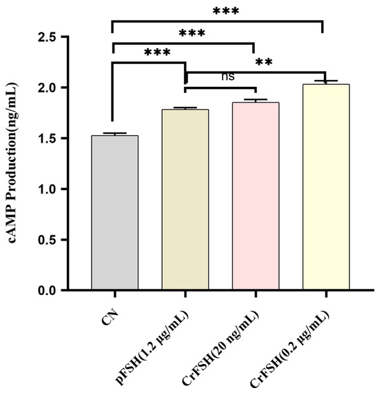 Comparison of cAMP production induced by 1.2 μg/mL of pFSH and 20 ng/mL and 200 ng/mL of CrFSH in vitro. ns, no significant; **, p < 0.01; ***, p < 0.001.