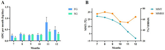 In this study, initial BW (IBW) and body size were measured at 9 months of age, and final BW (FBW) and body size were measured at 14 months of age. As shown in Table 1, the final BSL, CC, CW, RW and BC were significantly higher than those of the initial values (p < 0.05). The ADG in the FG was significantly higher than SG (p < 0.05) (Table 2). The ADG for each month of the two groups was calculated (Figure 1). As shown in Figure 1A, from July to December, the ADG in the FG was higher than that in the SG, except for September and October, when the ADG in the FG was slightly lower than that in the SG, but there was a dramatic difference in November. As shown in Figure 1B, the mean monthly temperature (MMT) decreased gradually from July (29.3 °C) to December (−1.3 °C), with a faster rate of decrease in November and December. The mean monthly relative humidity (MMRH) was lower in October (55%) and November (54%) than in the other months (64–73%).