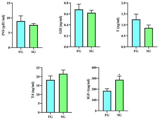 Hormones play important roles in animal growth. In the present study, the levels of growth hormone (GH), testosterone (T), thyroxine (T4), insulin (INS) and insulin-like growth factor-1 (IGF-1) were determined (Figure 2). The concentration of IGF-1 in the SG was significantly higher than that in the FG. There were no significant differences in GH, T, T4, or INS between the two groups. The concentrations of INS and GH in the FG were higher than those in the SG, and the level of T4 was lower than that in the SG.