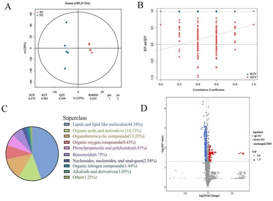 The chromatographic peaks in the QC samples were almost all consistent in positive and negative modes, indicating that the detection process had good stability and reproducibility. As shown in the score plots of OPLS-DA (Figure 3A), the FG was separated from the SG, indicating significant differences in the plasma metabolic profile between the two groups. R2X, R2Y and Q2 were 0.574, 0.993 and 0.594, respectively. The results of the 200 permutation tests showed that the slopes of R2Y and Q2Y were moderate and that the intercept of Q2Y was negative. (Figure 3B). These results indicated that the OPLS-DA model had good predictive ability and was not overfitted. A total of 3268 named metabolites were identified in the donkey plasma, of which 2562 had chemical classification information. Most of the metabolites were classified as lipids and lipid-like molecules (44.34%), followed by organic acids and derivatives (14.13%), organoheterocyclic compounds (13.23%), and organic oxygen compounds (8.43%) (Figure 3C). Differential analysis of the identified plasma metabolites revealed that 363 metabolites were downregulated and 101 metabolites were upregulated in the FG compared with the SG (Figure 3D). The top 10 significantly upregulated and top 10 significantly downregulated differentially abundant metabolites are shown in Table 3. The FC, p-value, VIP and annotation details for 464 differentially abundant metabolites can be seen in Supplementary File S1.