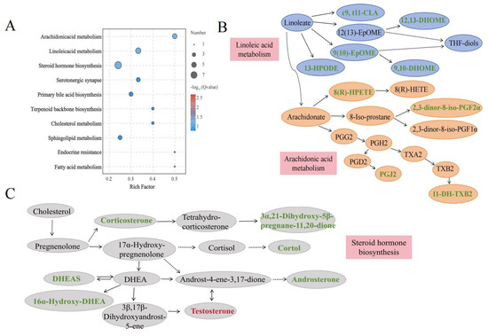 To understand the metabolic pathways associated with growth rate, metabolic pathway enrichment analysis based on the KEGG database was performed (Figure 4A). The pathway enrichment analysis revealed that the differentially abundant metabolites were enriched mainly in lipid metabolism pathways, including linoleic acid metabolism, arachidonic acid metabolism and steroid hormone biosynthesis, all of which were identified to be the key pathways involved in animal growth (Table 4). The pathway diagrams for linoleic acid metabolism, arachidonic acid metabolism, and steroid hormone biosynthesis can be seen in Figure 4B,C. The differentially abundant metabolites 2,3-dinor-8-iso-PGF2α, 11-DH-TXB2, 8(R)-HPETE, PGJ2, c9, t11-CLA, 12,13-DHOME, 9,10-DHOME, 9(10)-EpOME, 13-HPODE, DHEAS, testosterone, and corticosterone were involved in metabolic homeostasis.