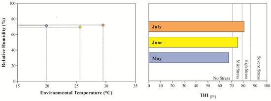 Environmental variable (i.e., relative humidity, temperature, temperature–humidity index (THI)) values recorded during the monitoring period.