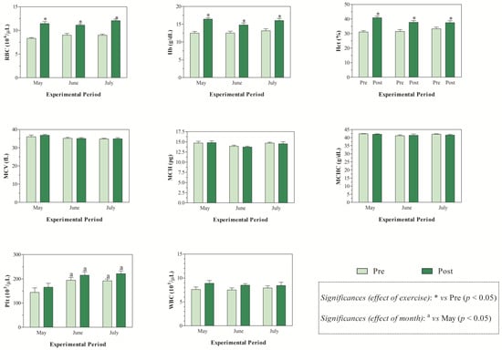 Mean values ± standard error of the mean (±SEM) of hematological parameters (i.e., red blood cell (RBC), hemoglobin (Hb), hematocrit (Hct), mean corpuscular volume (MCV), mean corpuscular hemoglobin (MCH), mean corpuscular hemoglobin concentrations (MCHC), platelet (Plt), and white blood cell (WBC)) measured in Standardbred horses before exercise (Pre) and within 5 min after the end of exercise (Post) during experimental period (May, June, and July).