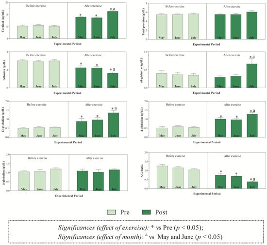 Data regarding respiratory rate (RR), heart rate (HR), and rectal temperature (RT) were recorded from each horse by the same operator. This was conducted while at rest in their box at 7:30 A.M. before the exercise (Pre) and within 5 min after the end of the exercise (Post), during the experimental period (May, June, and July). Specifically, the RR was determined by the observation of the movement of the horse’s flank, and a cycle of one rise and one fall of the flank constituted one breath. The HR was taken with a stethoscope. The RT was measured by means of a digital thermometer (HI92704, Hanna Instruments, Bedfordshire, UK), inserted 15 cm into the rectum. From all horses, blood samples were collected by jugular venipuncture and placed into 2 mL vacutainer tubes containing ethylenediaminetetraacetic acid (EDTA) and into 8 mL vacutainer tubes with cloth activator (Terumo Co., Tokyo, Japan). All samples were taken in the stables at rest before exercise (Pre) and within 5 min after the end of exercise (Post), after recording physiological parameters during the months of May, June, and July. Immediately after collection, the blood samples were transported for laboratory analysis. EDTA blood samples were analyzed for red blood cell count (RBC), hemoglobin concentration (Hb), hematocrit (Hct), mean corpuscular volume (MCV), mean corpuscular hemoglobin (MCH), mean corpuscular hemoglobin concentrations (MCHC), platelet count (Plt), and white blood cell count (WBC) [7]. The blood samples collected into cloth activator tubes were centrifuged (3000 rpm for 30 min) to obtain serum. The serum was then analyzed for the concentrations of cortisol, total proteins, albumin, and globulin fractions, as previously validated and described regarding horses [7].