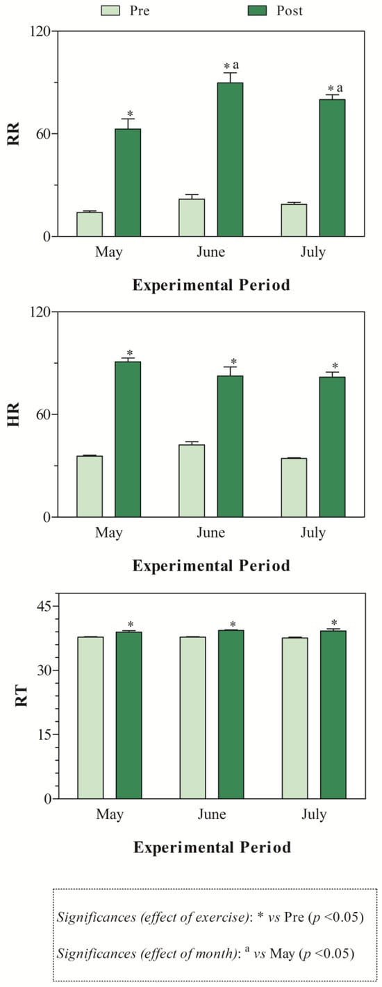Mean values ± standard error of the mean (±SEM) of physiological parameters (i.e., heart rate, HR; respiratory rate, RR; rectal temperature, RT) measured in Standardbred horses before the exercise (Pre) and within 5 min after the end of the exercise (Post) during experimental period (May, June, and July).