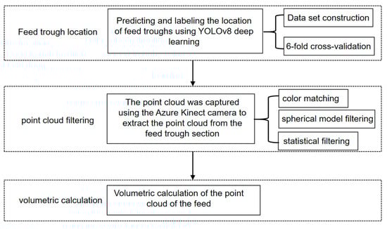 To address the interference of ambient light on point cloud processing, we integrated the YOLOv8 model with point cloud filtering techniques for the accurate estimation of residual feed volume in the feed troughs. The proposed methodology was implemented in three sequential steps, as illustrated in Figure 1.