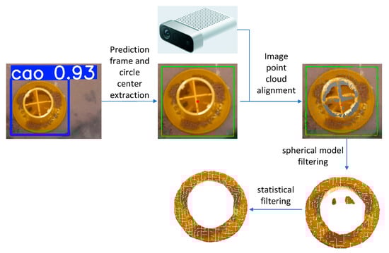 After localizing the feed trough using YOLOv8, this study aligned the predicted color images with depth information from Azure Kinect. The centroid coordinates of the feed trough were extracted from the registered colored point cloud. Using the centroid as the sphere center, the feed trough’s point cloud data were isolated from the complex environment. Statistical filtering was then applied to remove outlier points, yielding the final point cloud data of the feed trough. The complete point cloud processing workflow is illustrated in Figure 2.