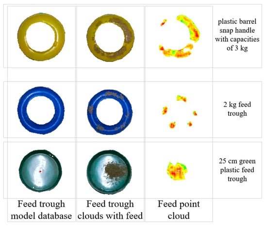 This study focuses on detecting the volume of residual feed in troughs using point cloud data. Since point clouds only capture surface depth information and cannot directly measure feed depth within the trough, a specialized extraction method was developed. The approach involved merging point cloud data from filled troughs with corresponding empty trough models from the feed trough model database. Points with height differences below a predefined threshold were removed to isolate the feed portion. Based on the depth differences derived from the merged point clouds, the feed volume was calculated. Figure 3 illustrates the process of extracting feed point clouds for three types of feeding troughs, while Figure 4 mainly shows the source of each point cloud during the feed point cloud processing procedure.