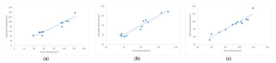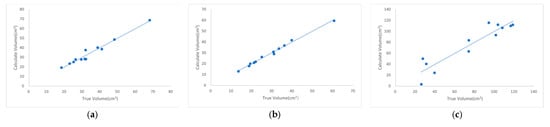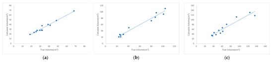 Regression curves of calculated volume (y-axis) versus actual volume (x-axis) for feed troughs of different diameters when using the same type of feed—data points represent experimental measurements of both values, and regression lines model their relationship: (a) Feed trough with a diameter of 0.25 m; (b) feed trough with a diameter of 0.27 m; (c) feed trough with a diameter of 0.38 m.