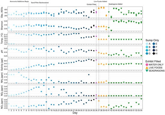 Dot plot showing environmental conditions within the aquarium over the course of the 54-day sampling period along with corresponding alpha-diversity metrics. Additionally, major events are illustrated with hashed lines. Letters A–H correspond to distinct phases of initial cycling before the exhibit was filled, defined by management decisions: A marks the initial start-up, B starts with the first temperature increase, C marks the beginning of ammonia additions, D represents the first topping off of the sump with saltwater, E marks a backwashing of the sand filter, F is the second topping off of the sump with saltwater, G is marked by a drop in temperature, and H represents the sump being topped off with freshwater.