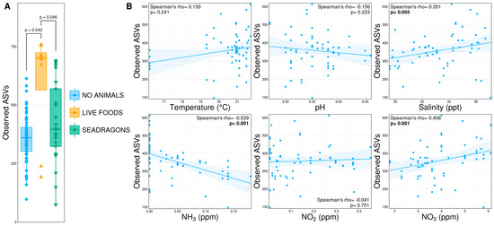 (A) Boxplots demonstrating richness (observed ASVs) between microbial communities in phases without animals present (‘no animals’), after the addition of nauplii and mysids (‘live foods’), and after the addition of weedy seadragons and thorny sea urchins (‘seadragons’). Significant differences are illustrated with a bar and p-value (pairwise Wilcoxon rank-sum ANOVA, n = 8–65, p < 0.05). (B) Scatterplots demonstrating correlations between environmental conditions and richness from initial cycling phases before the exhibit tank was filled and animals were added. Significant correlations are illustrated in bold text (Spearman’s rank-order correlation coefficient, n = 63, p < 0.05).