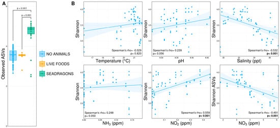 (A) Boxplots demonstrating diversity (Shannon index) between microbial communities in phases without animals present (‘no animals’), after the addition of nauplii and mysids (‘live foods’), and after the addition of weedy seadragons and thorny sea urchins (‘seadragons’). Significant differences are illustrated with a bar and p-value (pairwise Wilcoxon rank-sum ANOVA, n = 8–65, p < 0.05). (B) Scatterplots demonstrating correlations between environmental conditions and diversity from initial cycling phases before the exhibit tank was filled and animals were added. Significant correlations are illustrated in bold text (Spearman’s rank-order correlation coefficient, n = 63, p < 0.05).