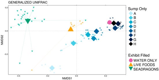 Non-metric multidimensional scaling (NMDS) of generalized UniFrac distances demonstrating differences between the 11 phases over the course of the 54-day sampling period. The NMDS demonstrates clustering of 16S rRNA gene sequences from communities collected during the phases of the study. The large opaque points represent the centroid for each phase, while the smaller more transparent points represent the individual communities from that phase. Significant differences are illustrated with bold text, and R2 values are displayed for each pairwise comparison between animal phases (pairwise PERMANOVA, n = 8–65, p < 0.05). Letters A-H correspond to distinct phases of initial cycling before the exhibit was filled defined by management decisions: A marks the initial start-up, B starts with the first temperature increase, C marks the beginning of ammonia additions, D represents the first topping off of the sump with saltwater, E marks a backwashing of the sand filter, F is the second topping off of the sump with saltwater, G is marked by a drop in temperature, and H represents the sump being topped off with freshwater.