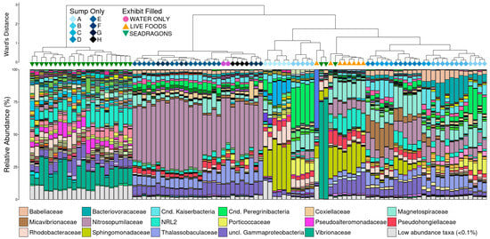 The seadragons clade is marked by higher diversity (more taxa and higher relative abundance of low abundance taxa) and increased relative abundances of Vibrionaceae and NRL2 coupled with the virtual absence of Nitrosopumilaceae, Thalassobaculaceae, and unclassified Gammaproteobacteria, which are highly abundant in other groups (Figure 5). The next largest difference is between the four latest phases before live foods were added, which are largely dominated by Nitrosopumilaceae, Thalassobaculaceae, and unclassified Gammaproteobacteria (Figure 5). Interestingly, filling the exhibit tank had little apparent impact on microbial abundances within the sump: communities from the day of the exhibit fill (purple circles) clustered tightly with the preceding two days when only the sump was filled (black diamonds). The live foods phase was most similar to the middle cycling phases but contained higher abundances of NRL2 and lower abundances of Babeliaceae than communities before nauplii and mysids were added (Figure 5). The large shift in community composition between the earliest to phases was largely the result of Sphingomonadaceae—dominant in phase A—becoming virtually absent in phase B coupled with a very large increase in the abundance of Candidatus Peregrinibacteria (Figure 5).