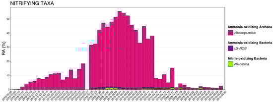 The relative abundances of known nitrifying taxa were calculated and plotted at the rank of genus across the entire 54-day sampling period (Figure 6).