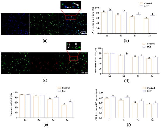 Effects of EGT on sperm acrosome and plasma membrane integrity, MMP, and ATP level. (a) FITC-PNA staining for sperm acrosome integrity. Among them, A represents sperm acrosome damage, while B indicates intact sperm acrosome. Scale bars: 50 μm. (b) Sperm acrosome intact rate (%). (c) SYBR-14/PI staining for sperm plasma membrane integrity. Among them, C denotes sperm plasma membrane damage, whereas D indicates intact sperm plasma membrane. Scale bars: 50 μm. (d) Sperm plasma membrane intact rate (%). (e) Sperm hMMP rate (%). (f) Sperm ATP level. The concentration utilized for EGT is 0.3 mM. n = 3, Different letters indicate significant difference (p < 0.05) between the control group and the EGT group on days 1, 3, 5, and 7.