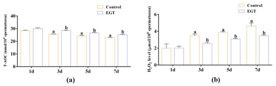 Effects of EGT on boar sperm T-AOC activity (a) and H2O2 level (b). The concentration utilized for EGT is 0.3 mM. n = 3. Different letters indicate significant difference (p < 0.05) between the control group and the EGT group on days 1, 3, 5, and 7.