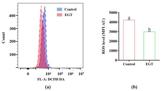 Effects of EGT on boar sperm ROS levels. (a) Sperm flow cytometry detected ROS. (b) Sperm ROS levels. The concentration utilized for EGT is 0.3 mM. n = 3. Different letters indicate significant difference (p < 0.05) between the control group and the EGT group.