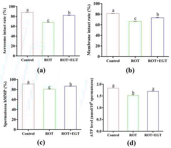 EGT improved the acrosome and plasma membrane integrity, MMP levels, and ATP levels in ROT-treated sperm. (a) Sperm acrosome intact rate (%). (b) Sperm plasma membrane intact rate (%). (c) Sperm hMMP rate (%). (d) Sperm ATP level. The concentration utilized for EGT is 0.3 mM and ROT is 10 μM. n = 3. Different letters indicate significant difference (p < 0.05) between the control group and the EGT group at 3h.
