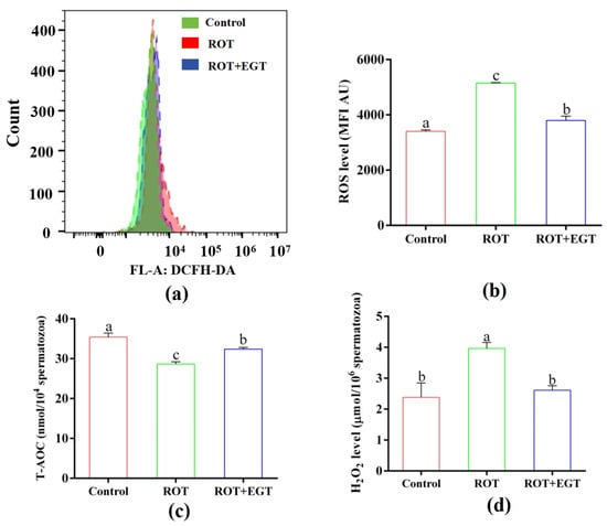 EGT improved the antioxidant capability in ROT-treated sperm. (a) Sperm flow cytometry detected ROS. (b) ROS levels. (c) T-AOC activity. (d) H2O2 level. The concentration utilized for EGT is 0.3 mM and ROT is 10 μM. n = 3. Different letters indicate significant difference (p < 0.05) between the control group and the EGT group at 3h.