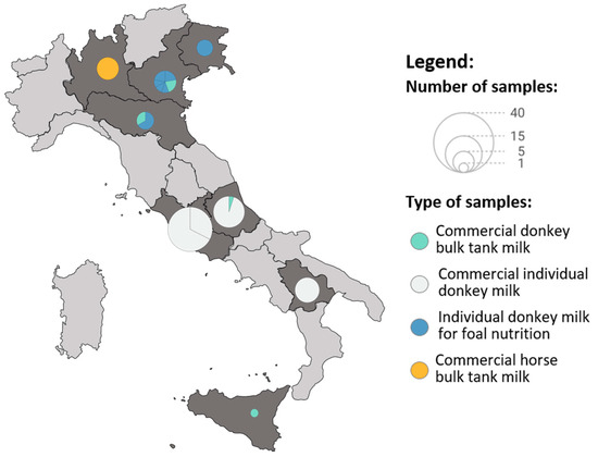 Figure 1. Samples’ distribution. Each circular area depicts the selected farms within the Italian region, with its size indicating the number of samples collected. The colors of the circles refer to the type of sample: commercial bulk donkey milk, individual donkey milk, individual donkey milk for foal nutrition, and commercial bulk mare milk.