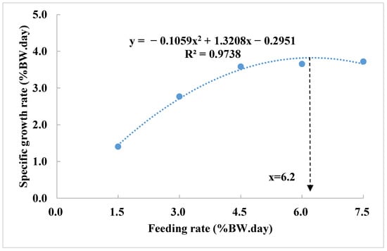Polynomial regression analysis of the relationship between feeding rate (FR) and specific growth rate (SGR). Data are presented as means based on three replications.