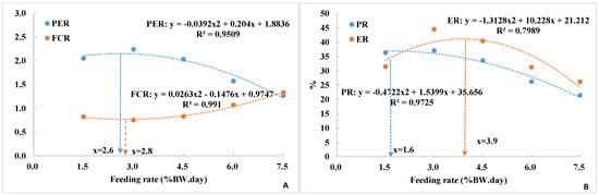 (A,B) Polynomial regression analysis of the relationship between feeding rate (FR) and protein efficiency ratio (PER), feed conversion ratio (FCR), protein retention (PR), and energy retention (ER) in juvenile yellow perch fed different feeding rates for 4 weeks. Data are presented as means based on three replications.