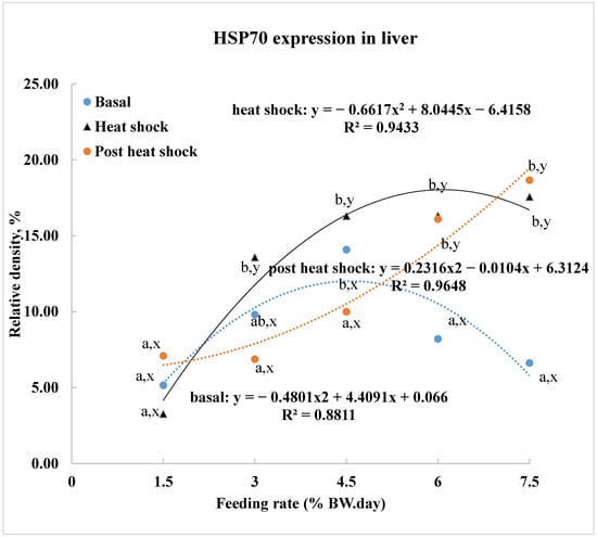 Heat shock protein 70 expression (% relative density to standard) in liver tissues of yellow perch subjected to different feeding rates over four weeks. Data are presented as means based on three replications. Letters a and b denote comparisons across feeding rates; letters x and y indicate comparison between stress conditions. Significant differences were determined at p < 0.05.